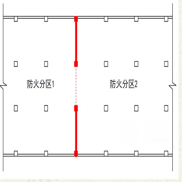 如上圖所示不管2個相鄰防火分區之間分隔的形狀如何,其分隔部分寬度均為所有距離相加,即L1和L2相加,其防火卷簾寬度也是d2和d1相加計算后滿足規范要求。
