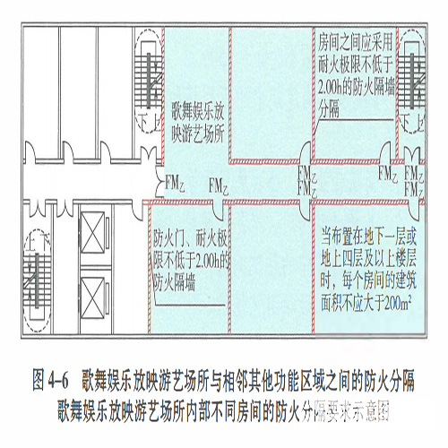 4.3.7 歌舞娛樂放映游藝場所的布置和分隔應符合下列規(guī)定:3 房間之間應采用耐火極限不低于2.00h的防火隔墻分隔;4 與建筑的其他部位">