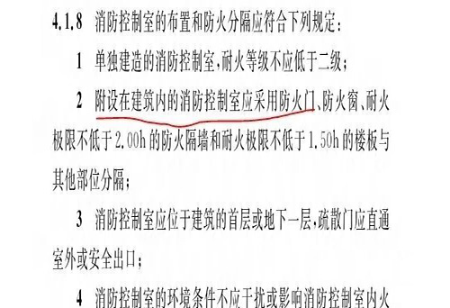 《建筑防火通用規范》(GB 55037-2022):第 4.1.8 條規定,附設在建筑內的消防控制室應采用防火門、防火窗、耐火極限不低于 2.00h的防火隔墻和耐火極限不低于 1.50h 的樓板與其他部位分隔。