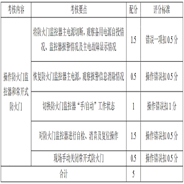 防火門操作考核內容防火門的操作方法??己藰藴?.正確對防火門監控器主電和備電自動切換功能進行測試; 2.正確排除電源的故障狀態; 3.正確判斷并切換防火門監控器的手動/自動控制狀態; 4.正確對防火門監控器進行自檢、消音及復位操作; 5.正確現場手動關閉常開式防火門并查看信號反饋情況。 考核方式模擬操作或現場操作。