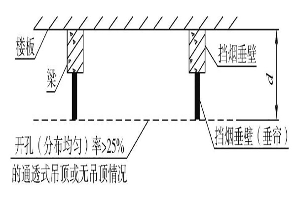 而設置通透吊頂(開孔率大于25%)的場所,起火時煙氣會進入吊頂內,所以擋煙垂壁應從樓板下開始設置,擋煙垂壁的高度不應小于儲煙倉厚度。