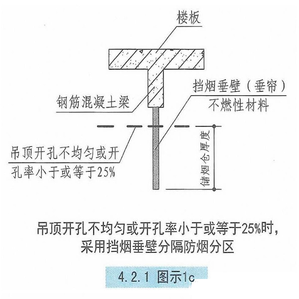 《建筑防煙排煙系統技術標準》(GB51251-2017)4.2.2/ 擋煙垂壁等擋煙分隔設施的深度不應小于本標準第4.6.2條規定的儲煙倉厚度。對于有吊頂的空間,當吊頂開孔不均勻或開孔率小于或等于25%時,吊頂內空間高度不得計入儲煙倉厚度。